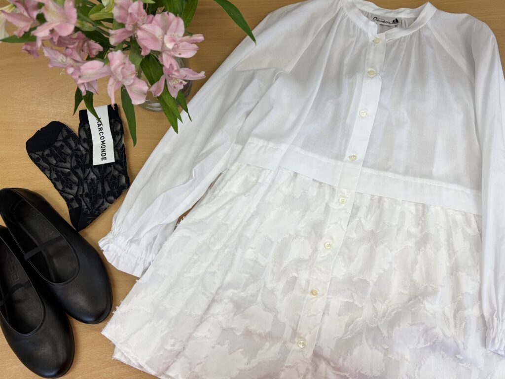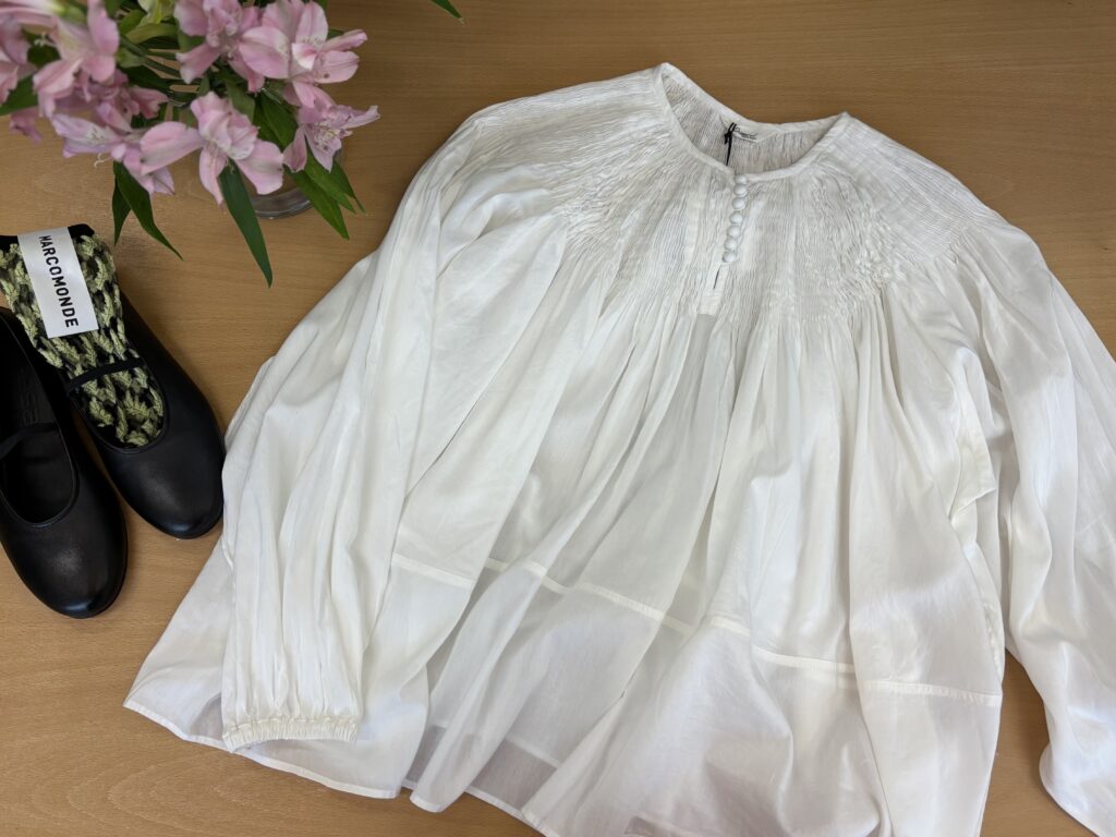 コットンシルクの肌触りの良さと襟まわりのハンドギャザーが美しい✨