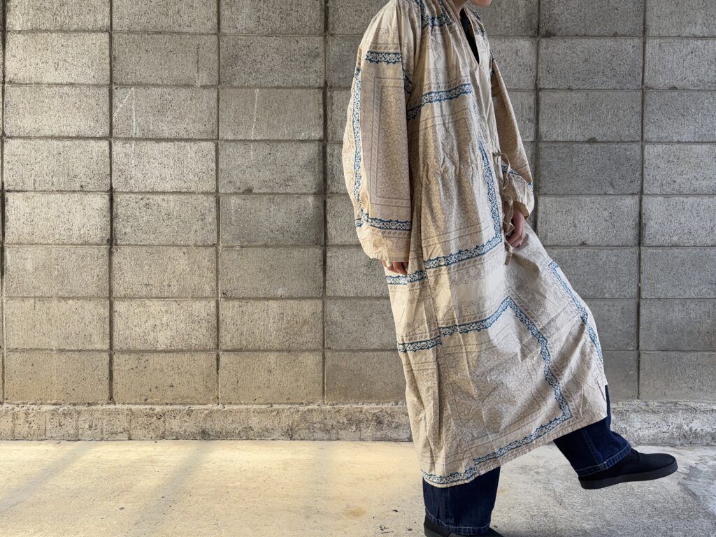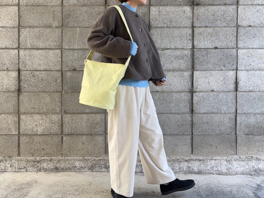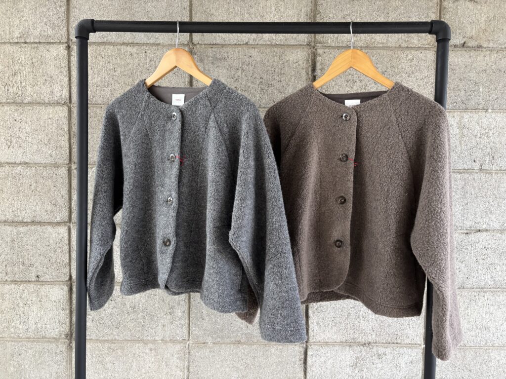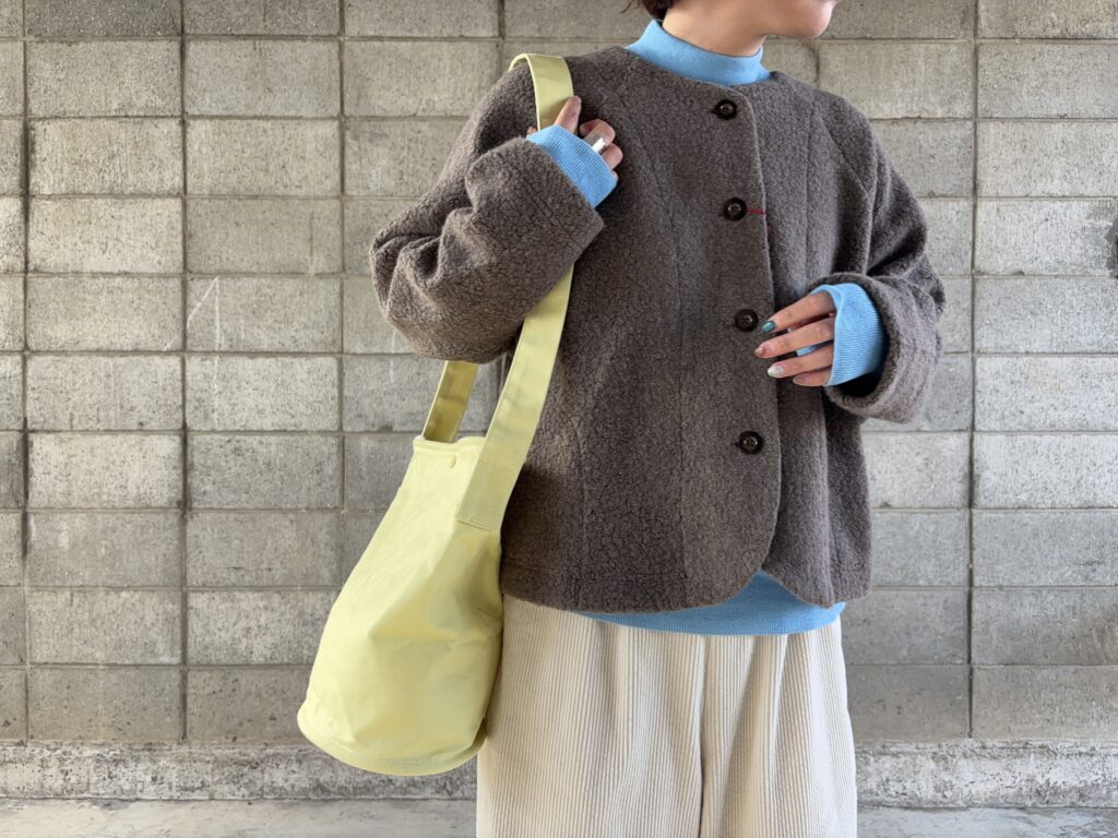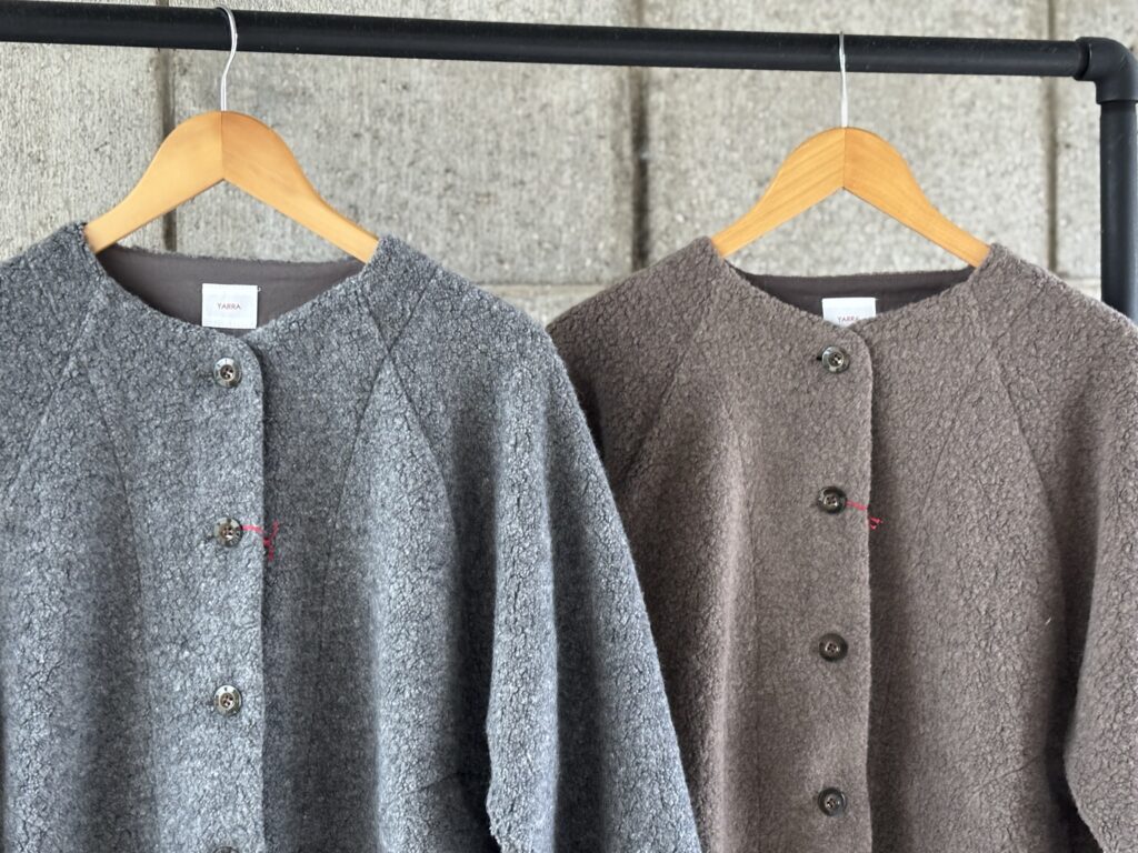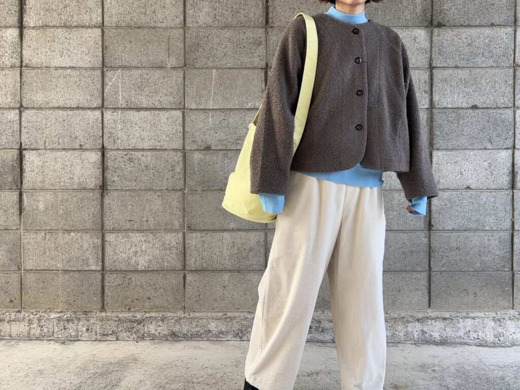 上に合わせているジャケットは、YARRAのウールリッチパイルラグランジャケット。