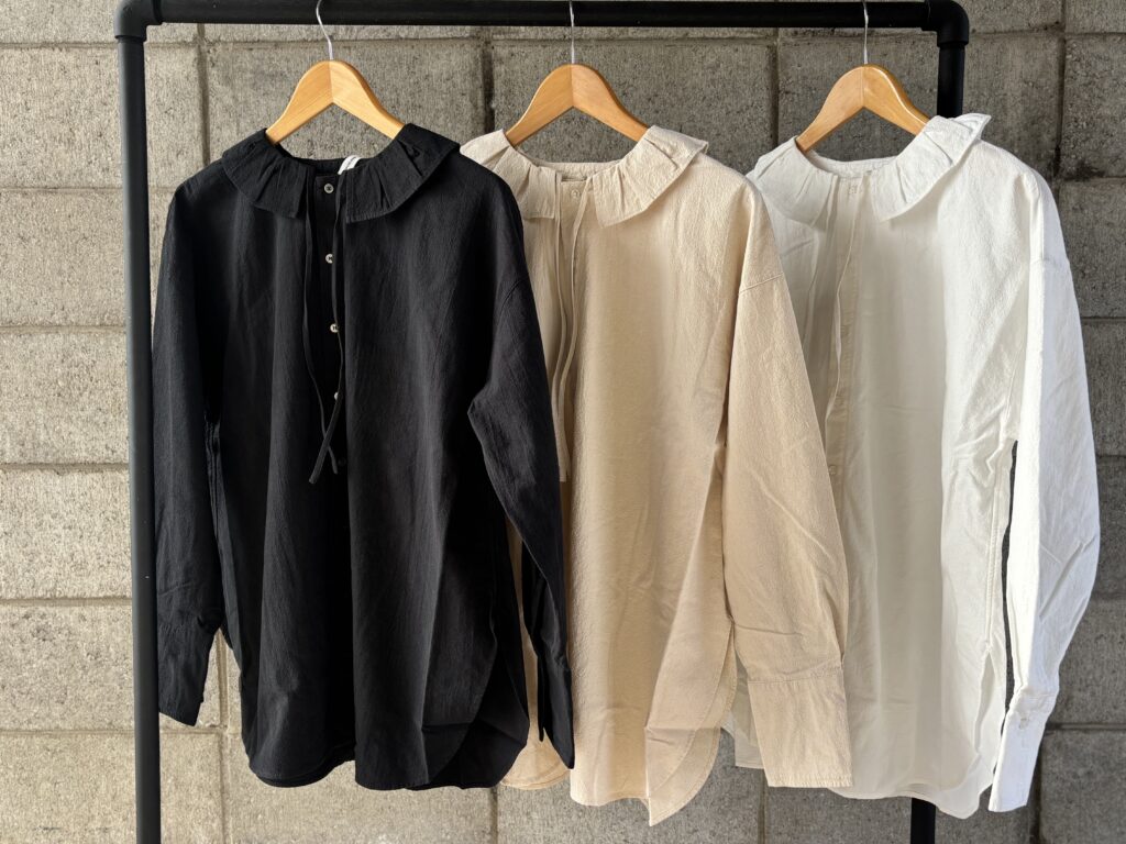 前後ともに前に着られるギャザーで作ったフリル衿と袖のシャツ。
