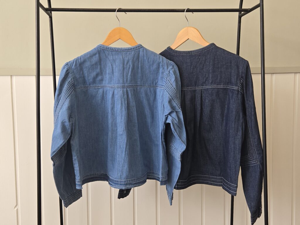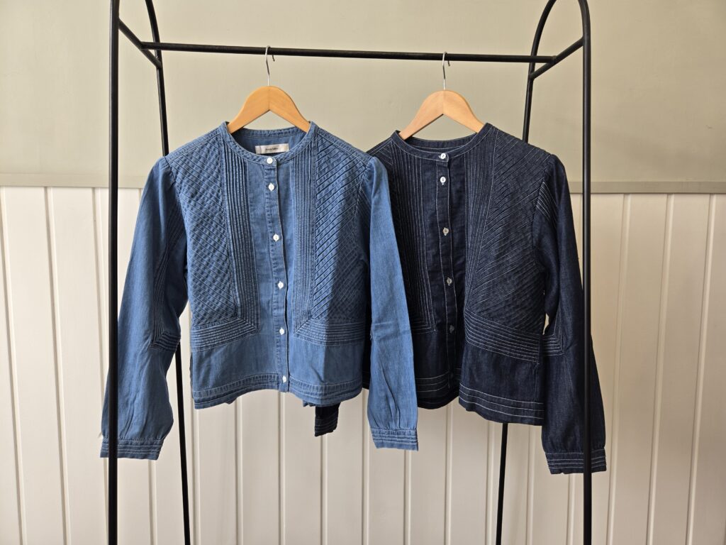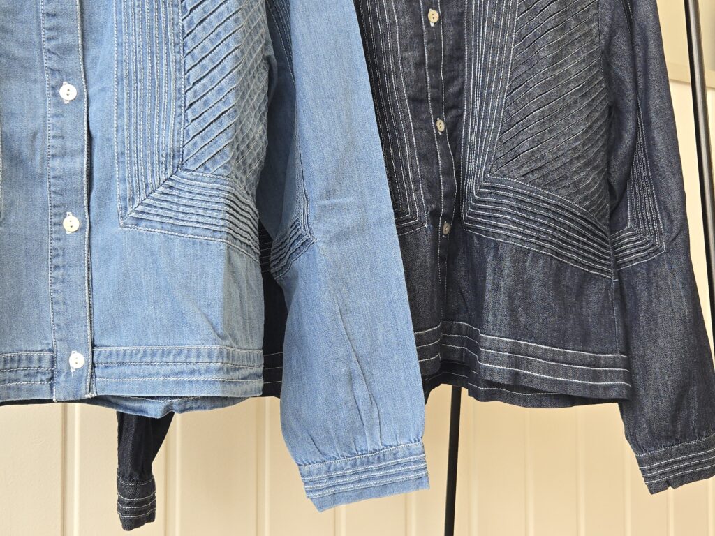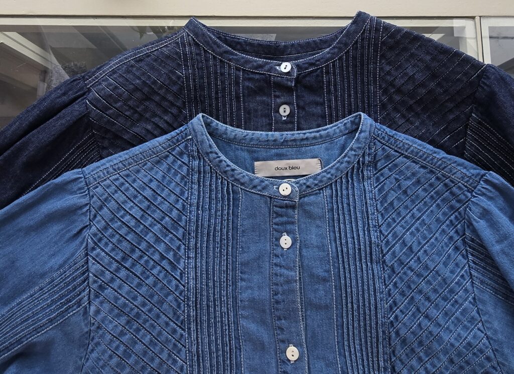 5.75ozの軽やかなデニム素材にスクエア切替の繊細なピンタックを施したブラウス。