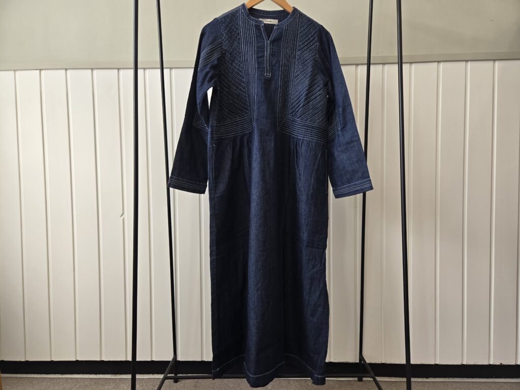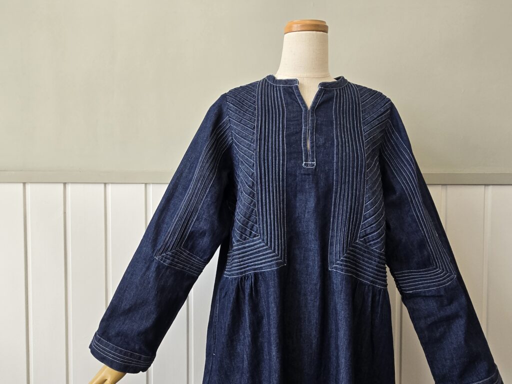 軽やかなデニム素材に、スクエア切替の繊細なピンタックを施したワンピース。