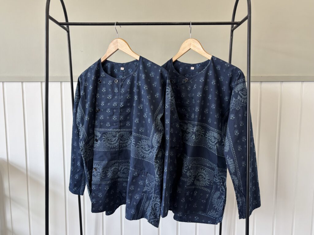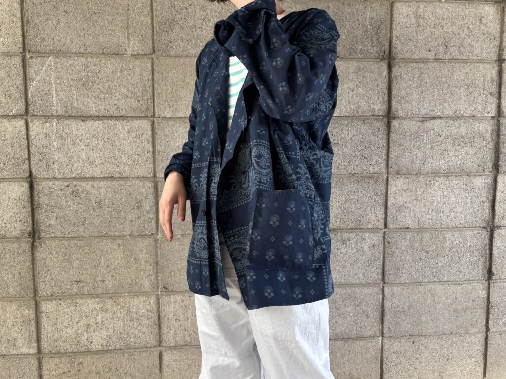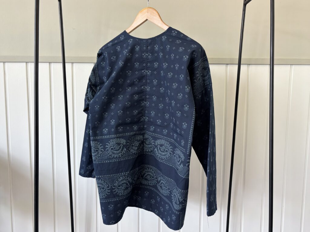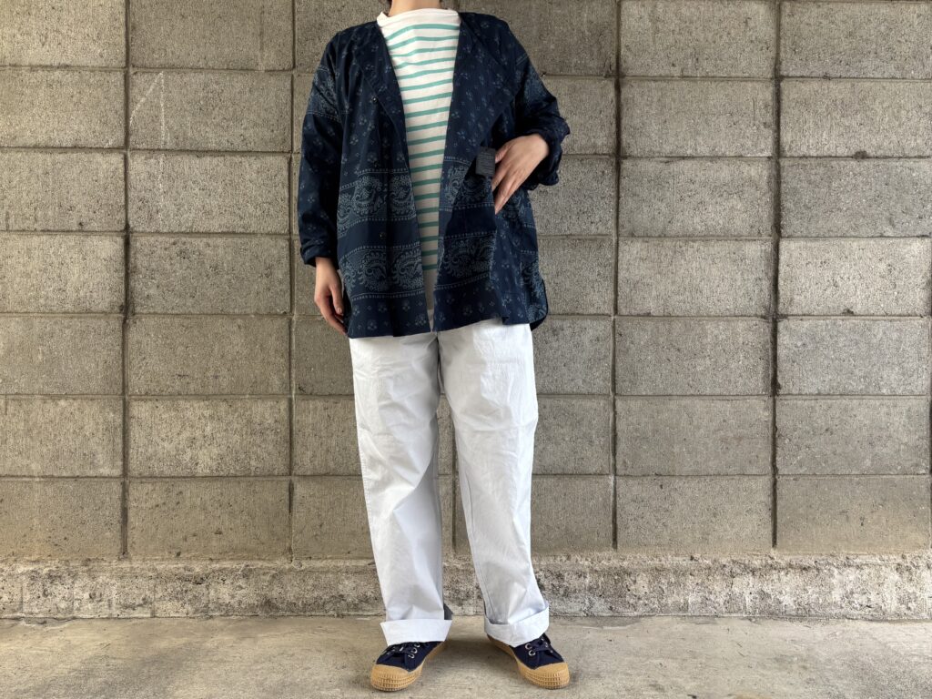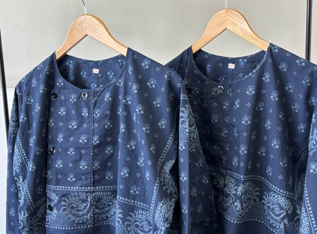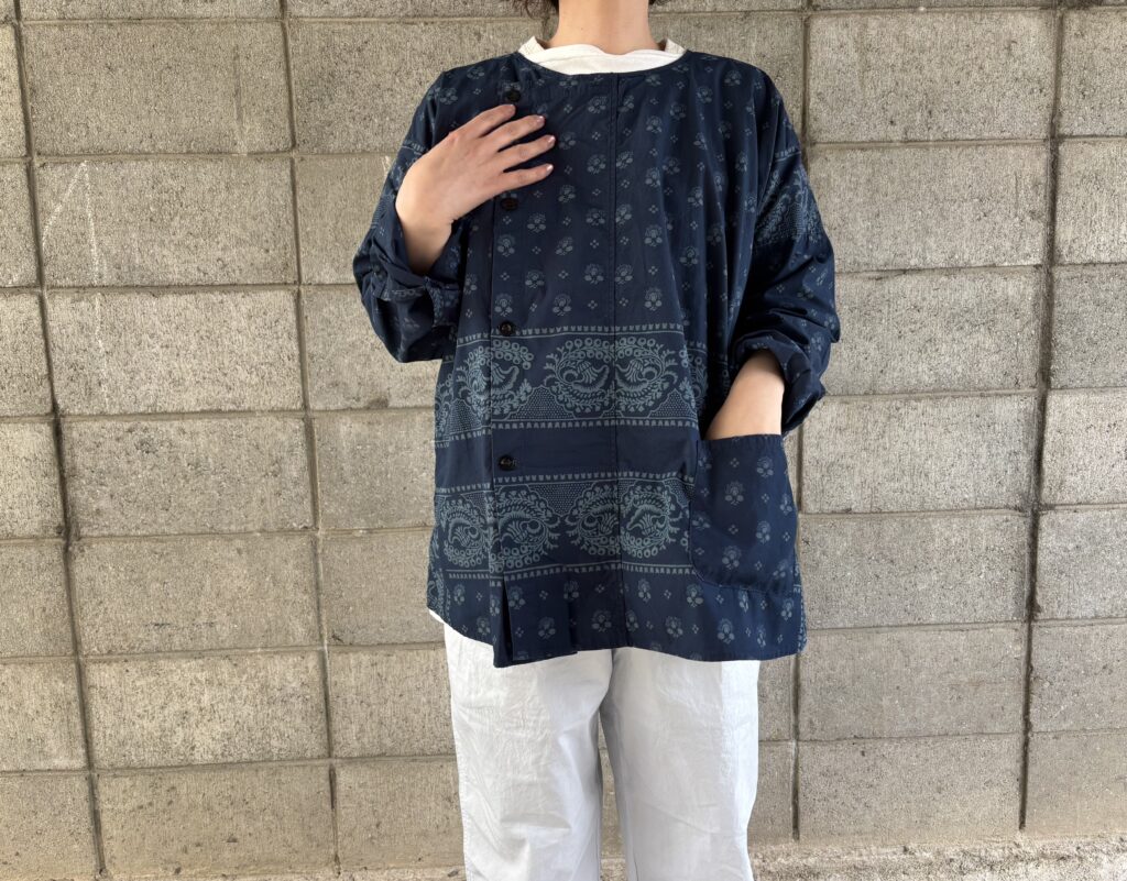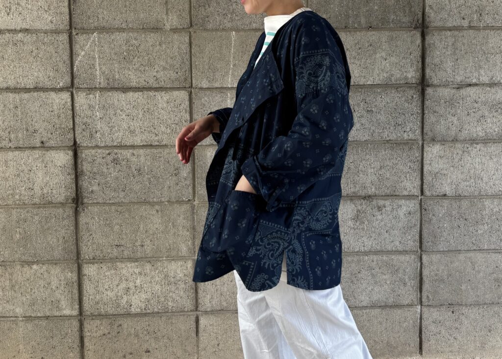 少し斜めについたボタンデザイン。首元はスッキリとしたノーカラーにバンダナ柄がかっこいいです!!!