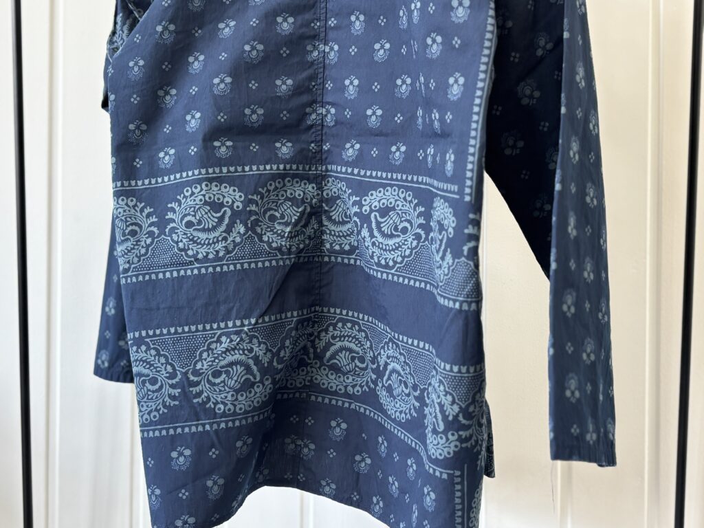 当時のようなインディゴの色目に深みを持たせる為、可抜染料で下染めし、インディゴ染めを重ねオートスクリーンでは出来ない100cmの柄を2枚で手捺染大版プリントが施されています。