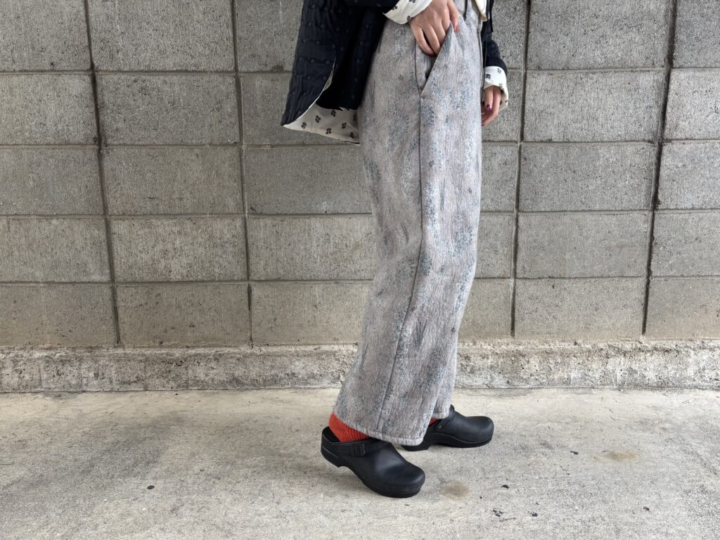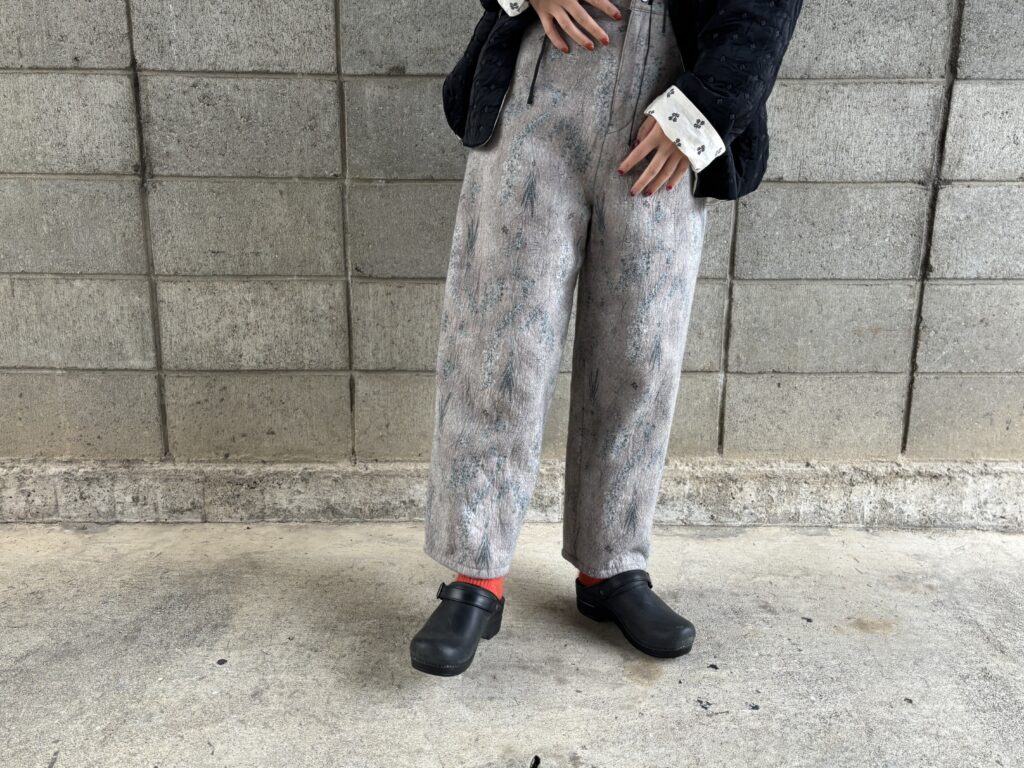 ふんわりとした花柄のパンツはアクセントになりながら、