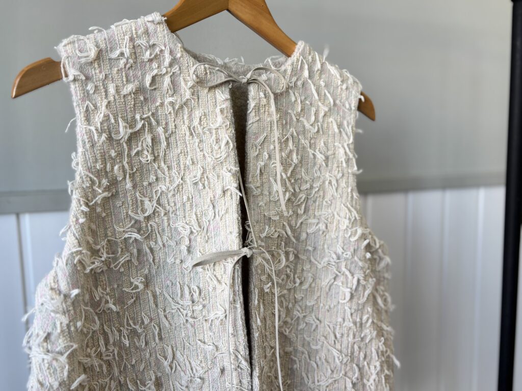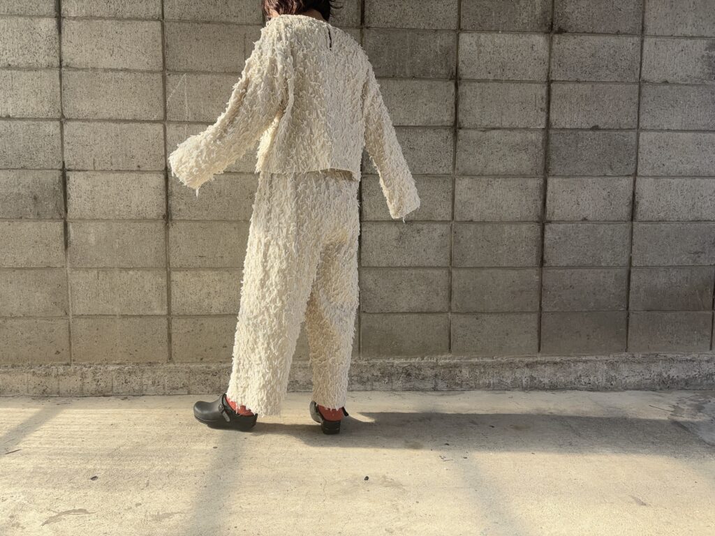 ぽこぽことした糸と、スラブ感の糸を奥行きを感じる配置で織り込んだ生地が特徴的です。