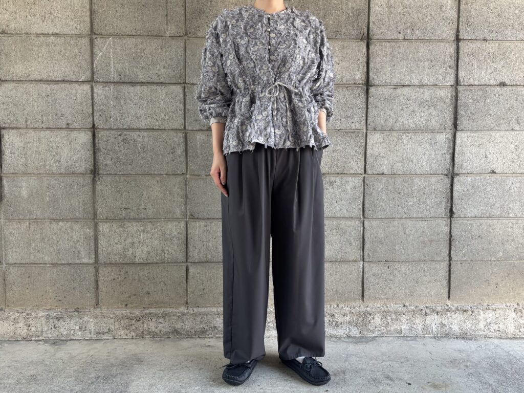 トップスに合わせて少し艶感のあるvent d’ouestのタックパンツを合わせました。