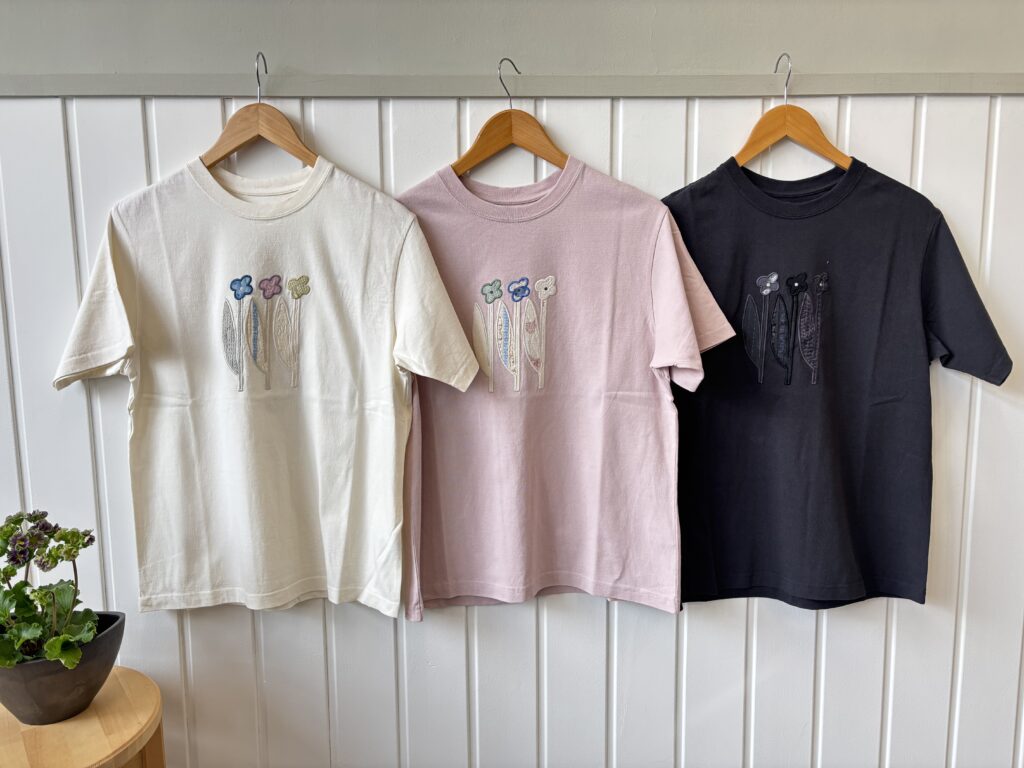 花びらや葉っぱを表現したドット部分には、数色の糸を使用しており