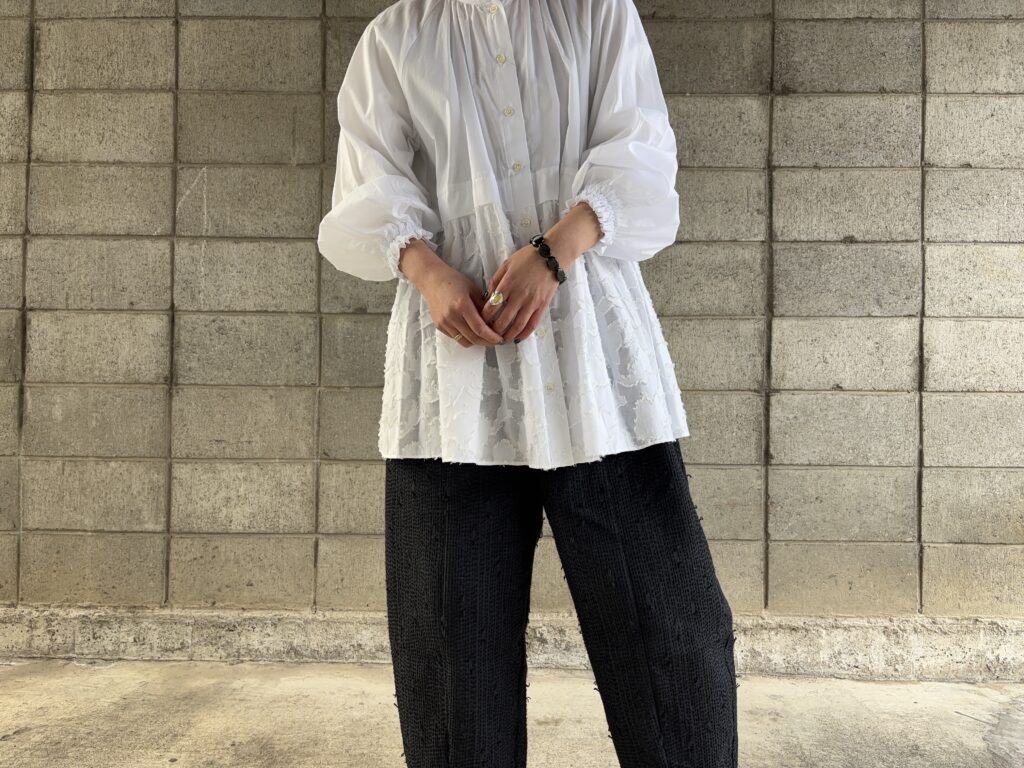ジャガードにカットを施したギャザーブラウス。