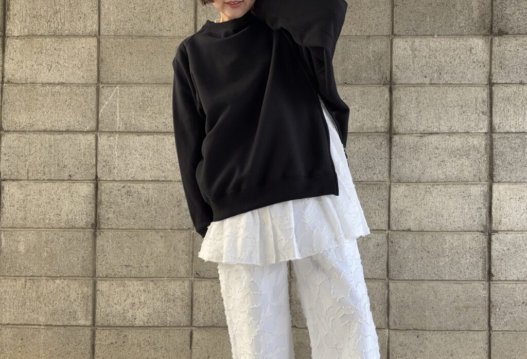 ブラウスの上にHAVER SACKのサイドジップスウェットを着て、