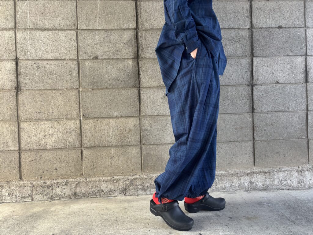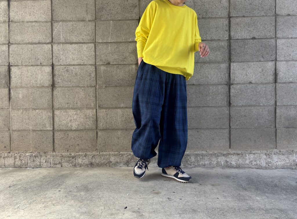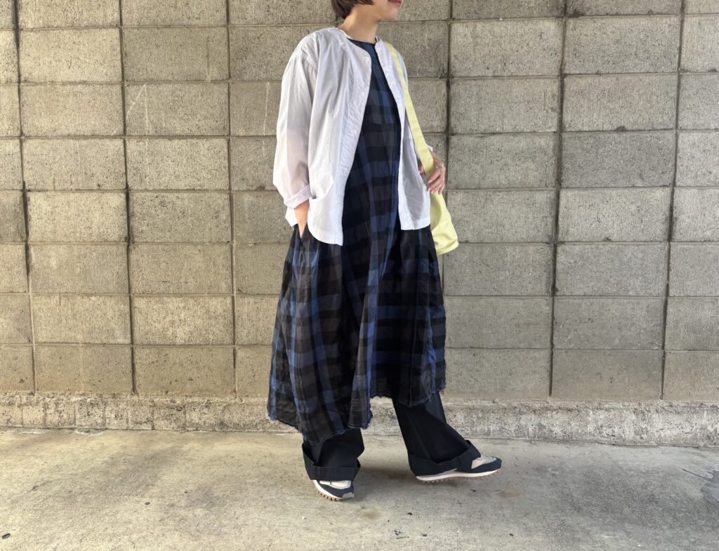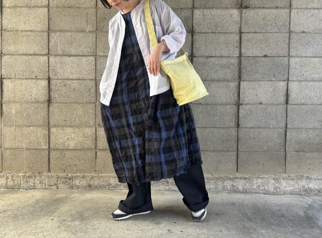 チェックのワンピースの下に履いているのもYarmoのワークパンツ