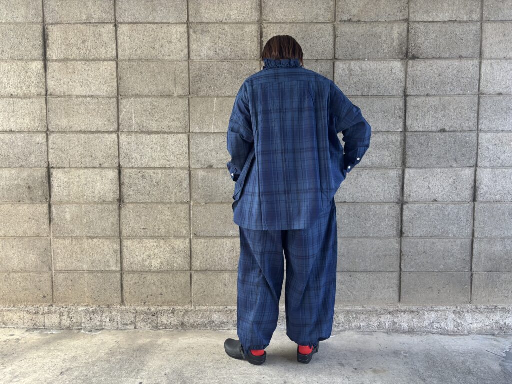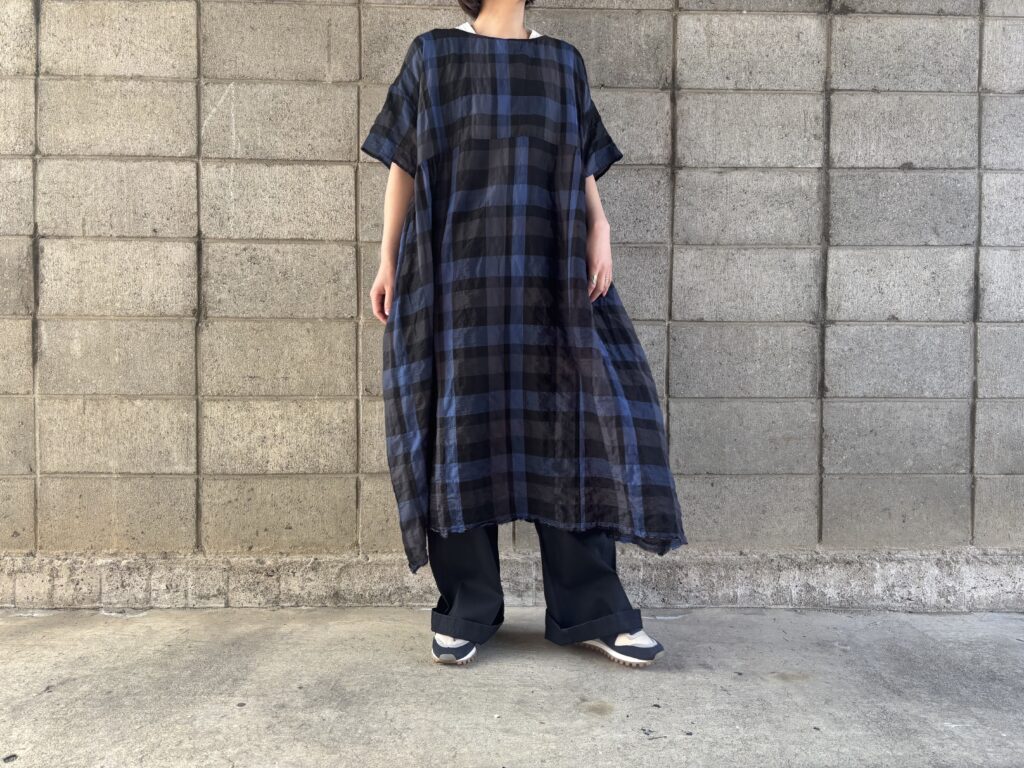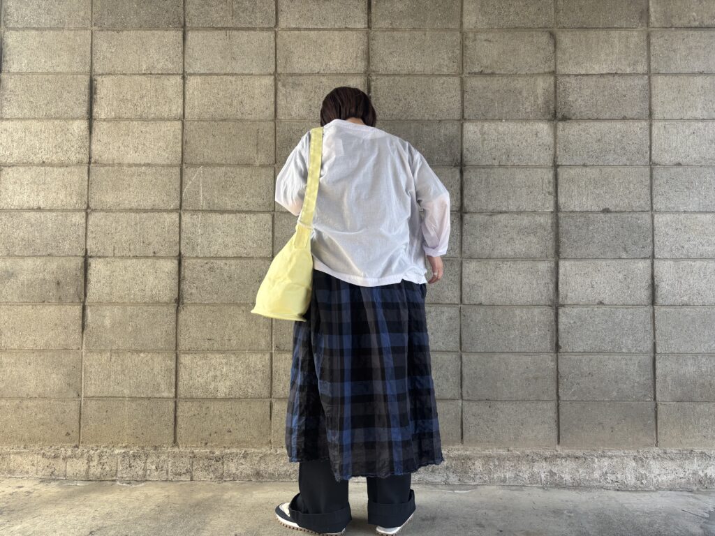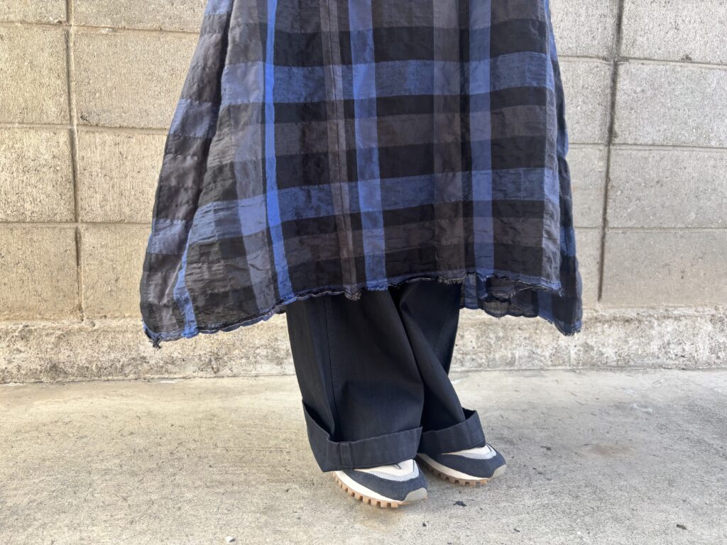 チェックのワンピースの下に履いているのもYarmoのワークパンツ