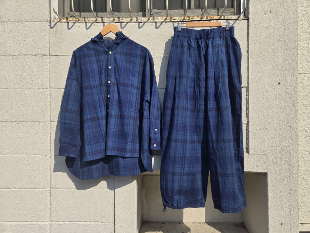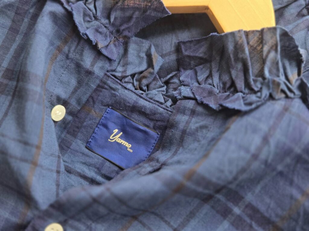 コットン素材のダークネイビーが大人っぽいマドラスチェックの襟フリルシャツ。